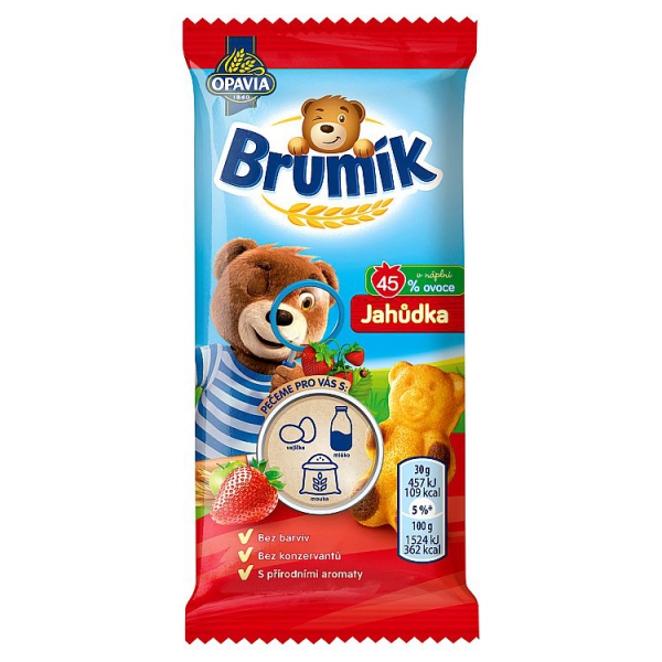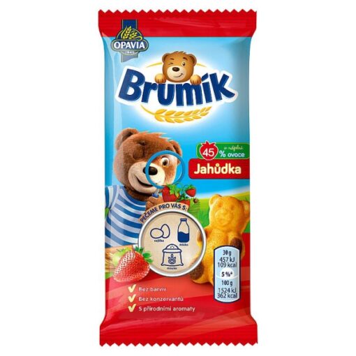 Ovocná náplň 28 % [glukózo-fruktózový sirup, ovocná dreň 45 %** (koncentrát jablkovej drene 27,3 %, jahodová dreň 17,7 %), zvlhčovadlo (glycerol), regulátory kyslosti (kyselina citrónová, citrany sodné, kyselina jablčná), zahusťovadlo (xantánová guma), koncentrát bazovej šťavy, prírodná aróma]Pšeničná múka 24 %