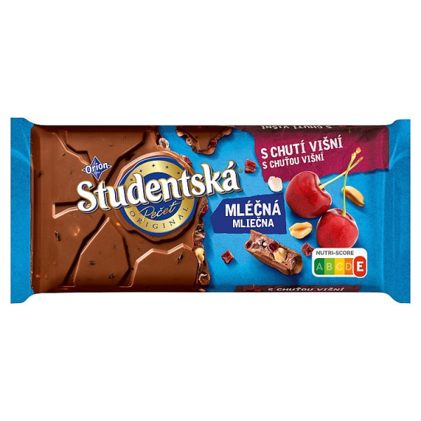 Mliečna čokoláda s arašidmi, želé a kúskami s chuťou višní.