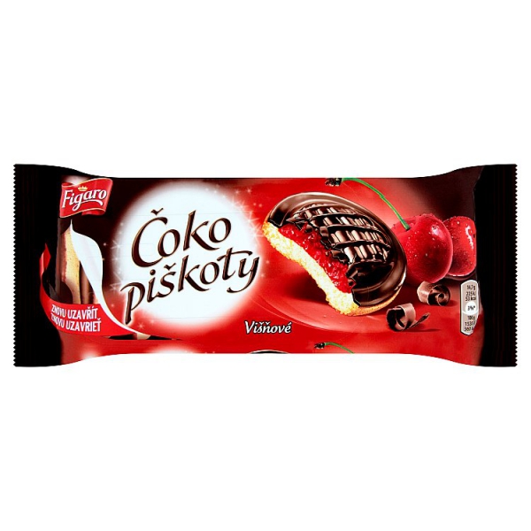 – Jemné pečivo s želé (52 %) s višňovou príchuťou polomáčané čokoládou (15 %).