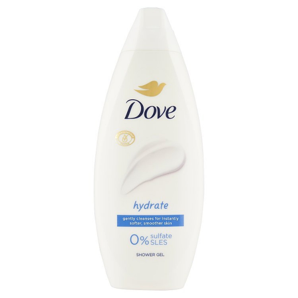 Dove sprchovací gél Hydrate s jemnou púdrovou vôňou jemne čistí pre okamžite jemnejšiu a hladšiu pokožku.