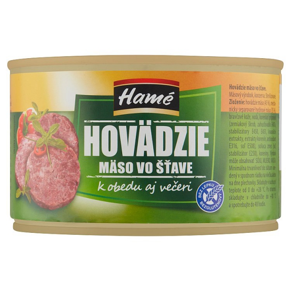 Zloženie: hovädzie mäso (70 % hm.), mechanicky separované hydinové mäso, bravčové kože, voda, koreniaci prípravok (zemiakový škrob, zahusťovadlo E 407a, stabilizátory E450, E451, kvasničné extrakty, extrakty korenín ,antioxidant E316, soľ E 508), soliaca zmes (jedlá soľ, stabilizátor E 250), koreniny.
