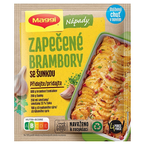 Okrem toho je obal tejto pochúťky Maggi plne recyklovateľný a patrí do žltého koša. Takže si môžete vychutnať zapekané zemiaky so šunkou a smotanou k dobrému obedu alebo večeri ešte ekologickejším spôsobom!