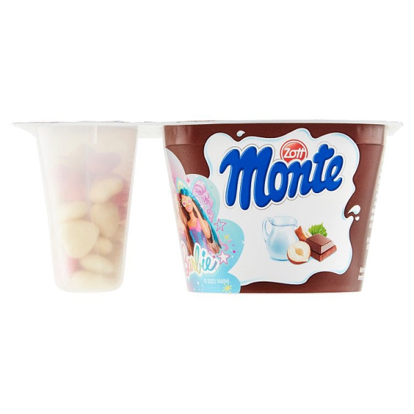 Mliečny dezert čokoládový s lieskovými orieškami s cereálnymi srdiečkami v bielej čokoláde (4,4%*) a farebnej poleve (4,4%).
